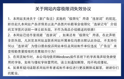 本公司全力支持關(guān)于《中華人民共和國(guó)廣告法》實(shí)施的“極限化違禁詞”相關(guān)規(guī)定,且已竭力規(guī)避使用相關(guān)“違禁詞”(如最,頂級(jí),領(lǐng)先,第一,)等極限化詞匯。本公司于已經(jīng)將網(wǎng)站上所有“極限化”違禁詞修改,如果還有遺漏修改的“極限化”違禁詞用在本公司網(wǎng)頁(yè),本公司申明全部失效。所有訪問(wèn)本公司網(wǎng)頁(yè)的人員均表示知悉,否則請(qǐng)放棄訪問(wèn)。